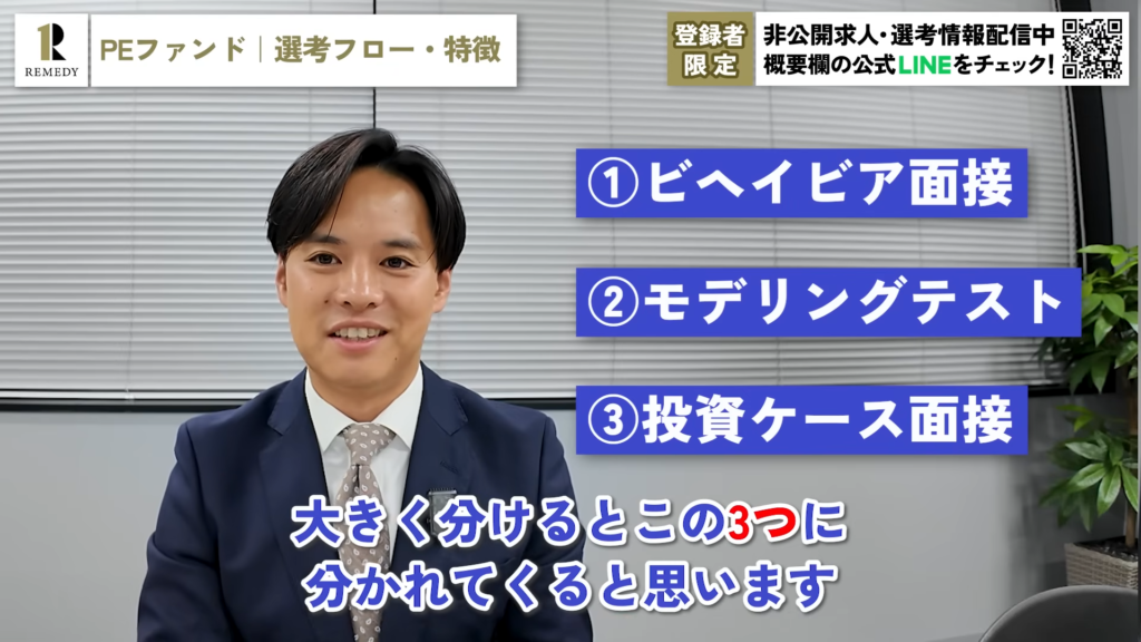 飯田:簡単に分けると選考の種類は3つあります。(1)ビヘイビア面接、(2)モデリングテスト、(3)投資ケース面接です。1つずつ簡単に説明します。